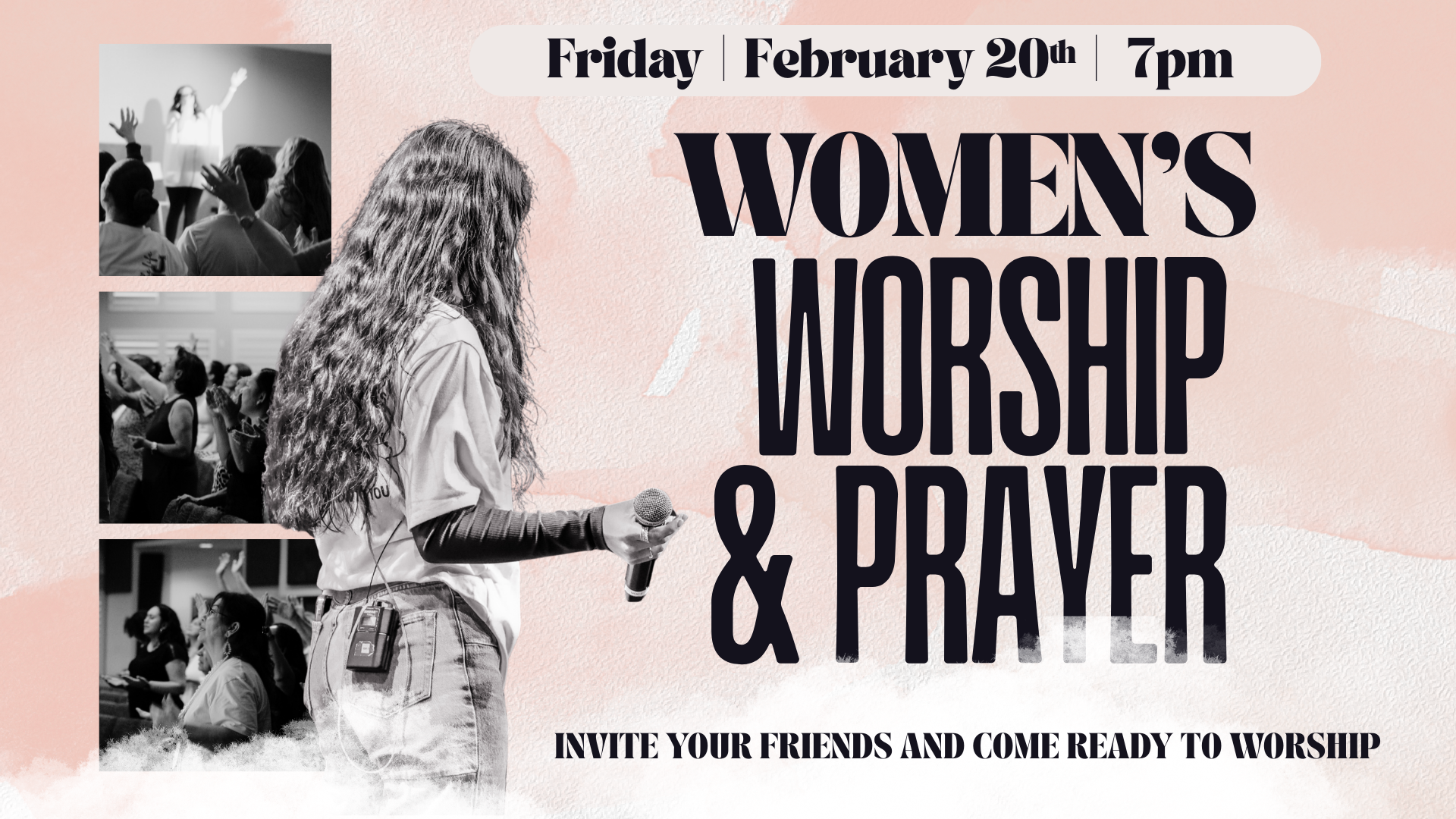 Ladies, let's get together to worship and agree in prayer. Come out and invite your friends while we worship our King! All ages are invited to join us. We will see you Friday, February 20th at 7 pm!